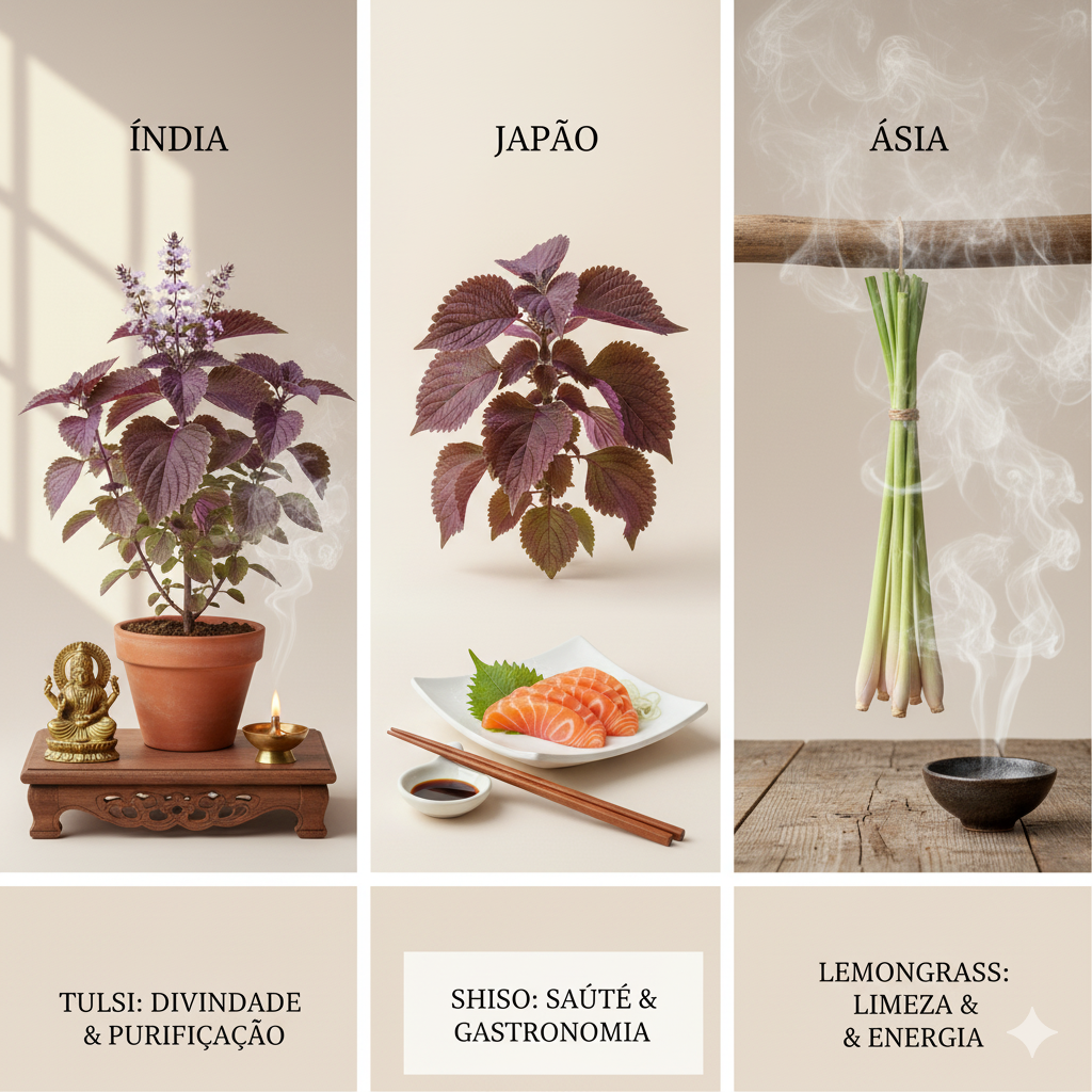 - Tulsi: Na Índia, o manjericão sagrado é considerado uma planta divina, a encarnação da deusa Lakshmi. É comum encontrá-lo em templos e lares hindus, onde é venerado e utilizado em rituais de purificação.